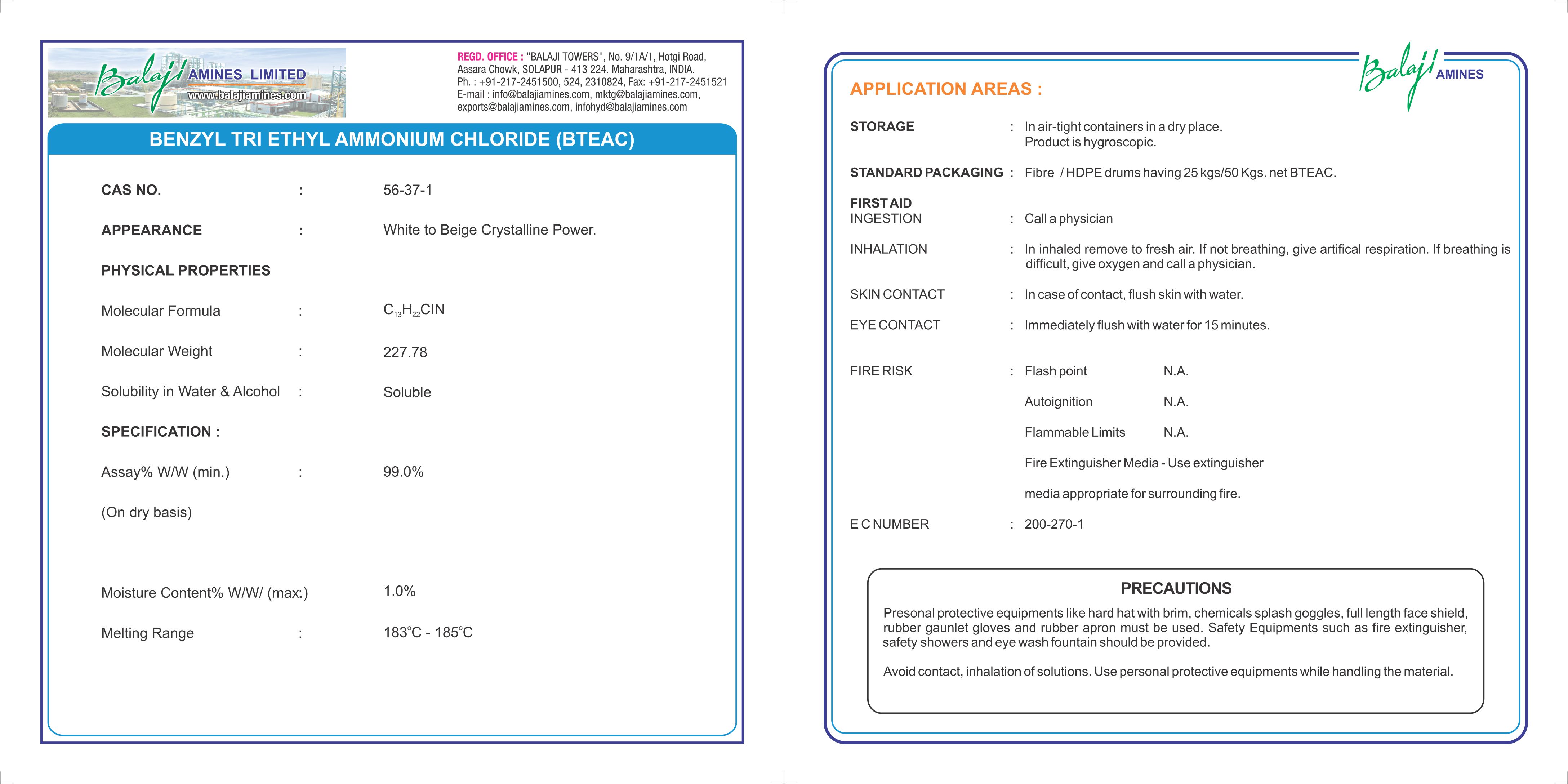 | Benzyl Tri Ethyl Ammonium Chloride | (BTEAC) | View |